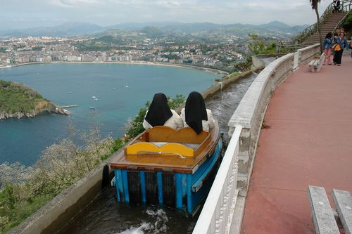 En el Monte Igueldo, descubro a la mañana siguiente, la acera es sin embargo una angosta escalera para luego desaparecer en la pendiente. La subida es una ascensión en altura pero también en el calendario. Allá arriba me esperan algunos de los primeros recuerdos de mi vida, con apenas tres años, cuando vivía en Pamplona y pasábamos el día con mis padres y mis hermanas. Salgo del funicular y me encuentro con la infancia: la memoria del paseo en barquita por el río misterioso, un canal de agua circular accionado por una noria, sin más misterio que los sueños de los niños, y cuyo recorrido abre vistas al mar en un lado y a la pared de la montaña en el otro.
